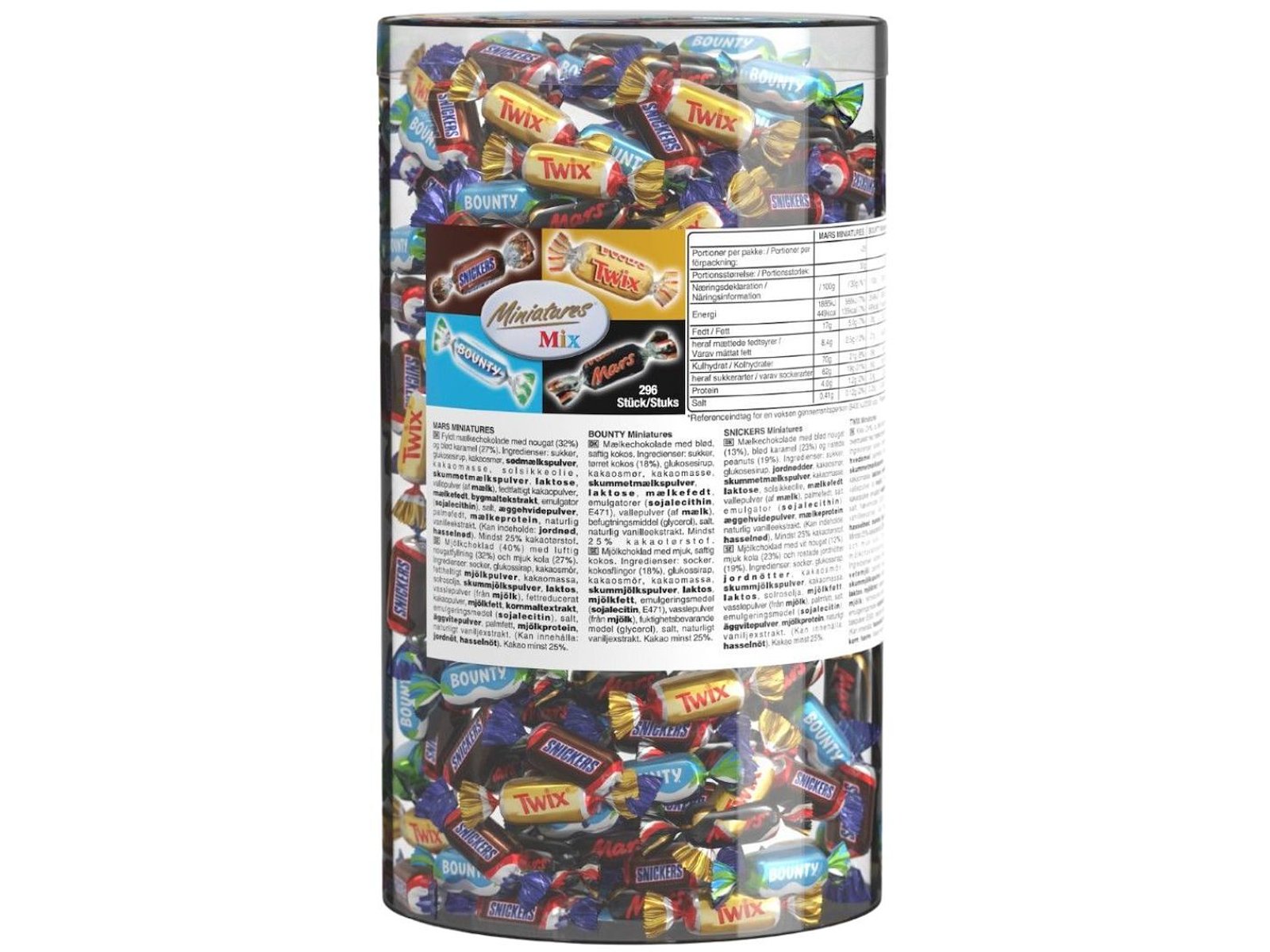 Denne 3 kg Mixet Miniatures pakke indeholder ca. 296 små stykker af de elskede chokoladebarer Snickers, Twix, Mars og Bounty. Perfekt til kontorer, receptioner, mødelokaler, fester og hyggelige sammenkomster.