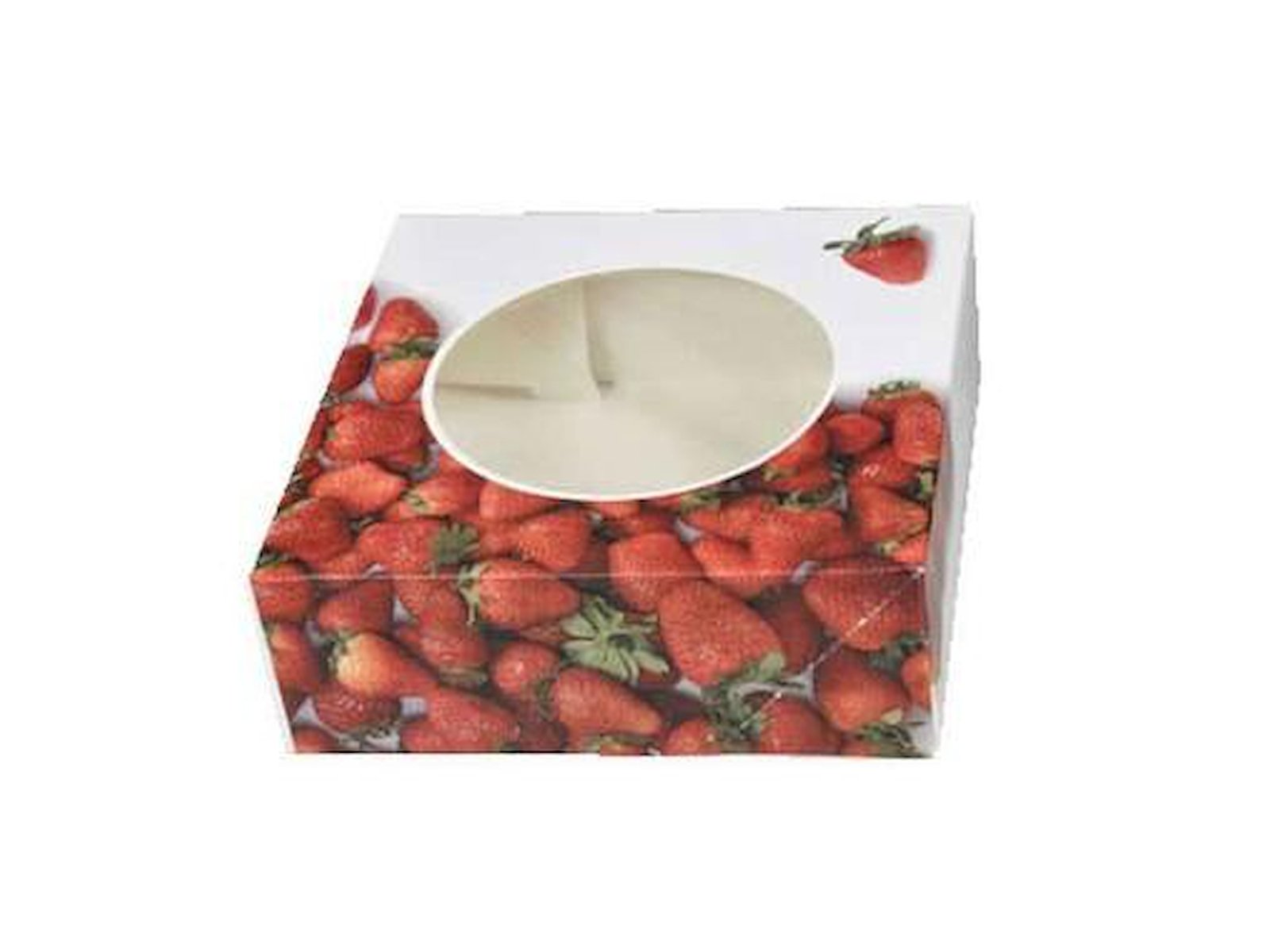 Kageæske hængslet låg jordbærdesign L200xB200xH70mm pap med rund rude hvid