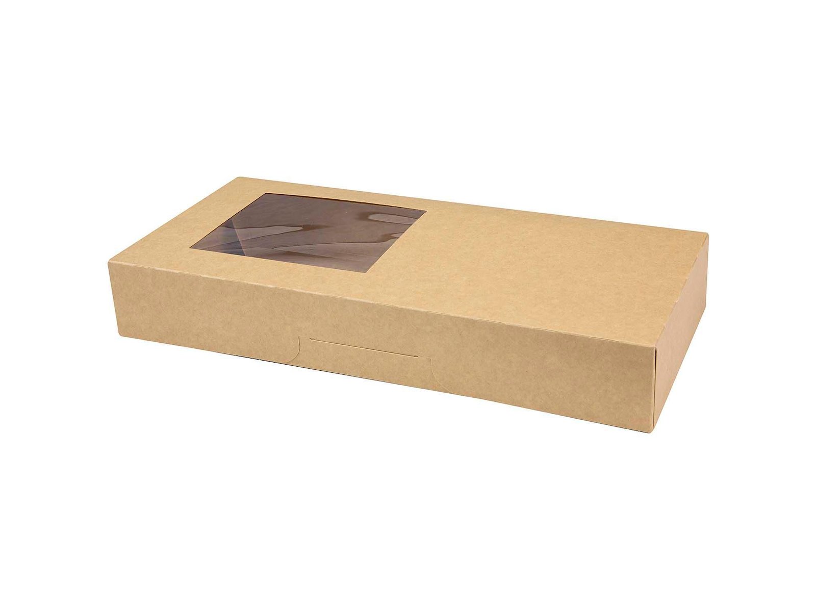 Kageæske/Sushiæske hængslet låg L320xB150xH50mm pap med PE og rude i siden brun