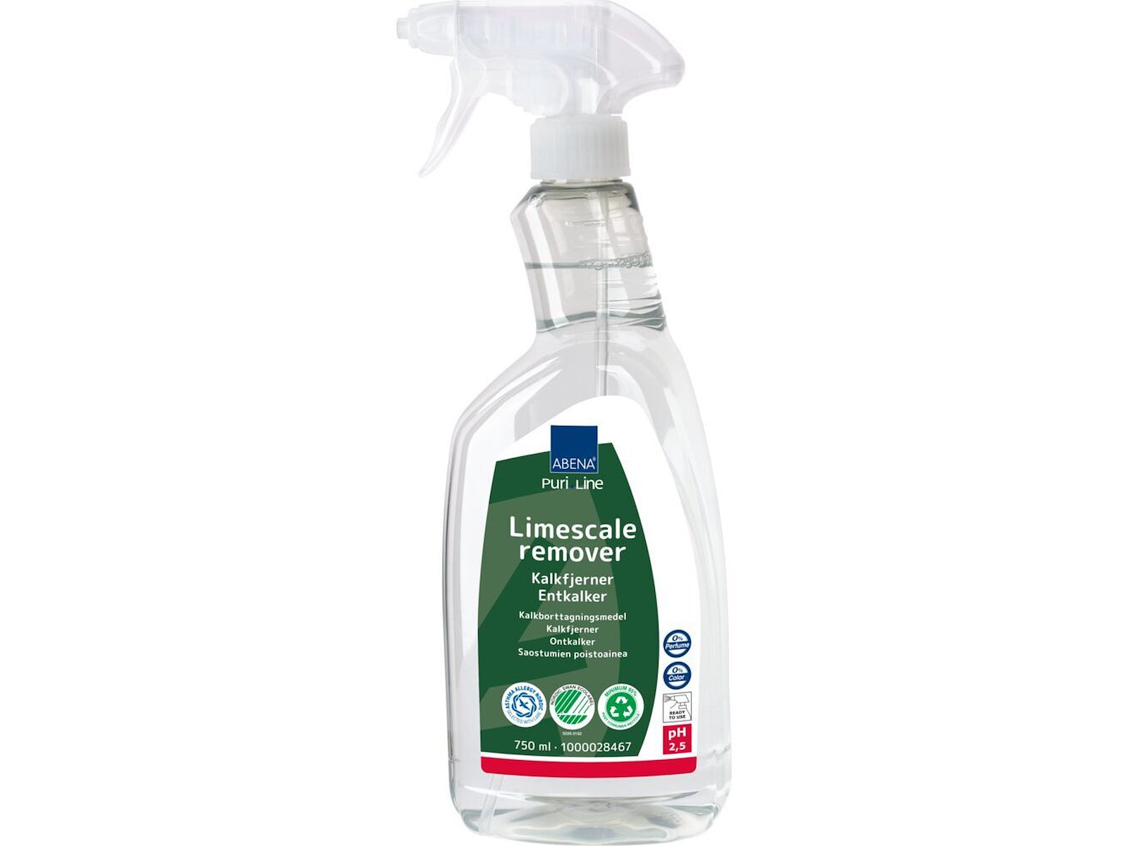 ABENA Puri-Line Kalkfjerner er Svanemærket og certificeret med Asthma Allergy Nordic, hvilket dokumenterer et reduceret indhold af problematiske stoffer og en mere ansvarlig miljøprofil – uden at gå på kompromis med rengøringseffekten. Produktet er derfor et sikkert valg i institutioner, kontorer, sundhedssektoren, kantiner og andre professionelle miljøer.