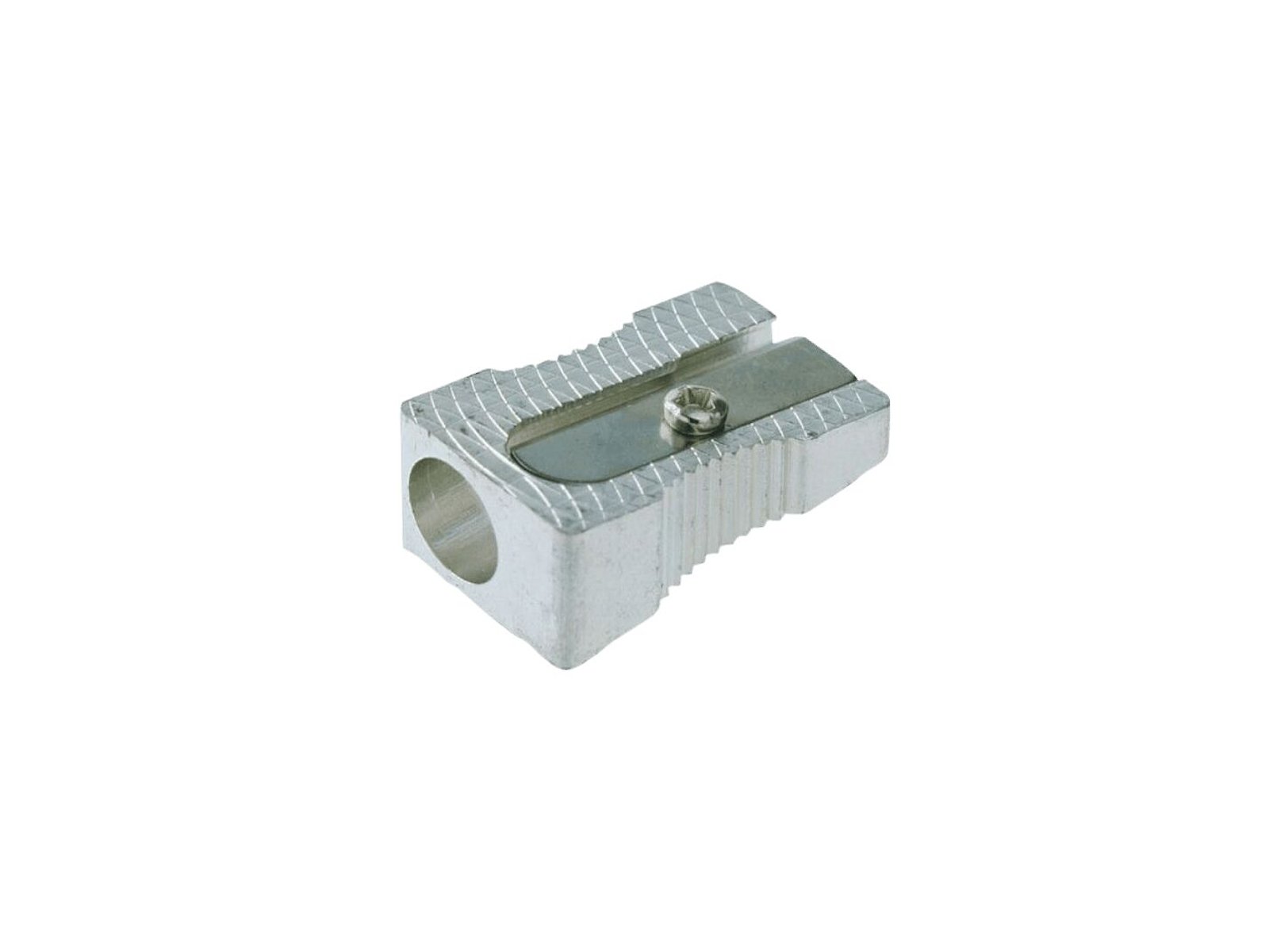 Blyantspidser m/enkelt hul. Børstet aluminium med skruet blad. Passer til de fleste blyanter.