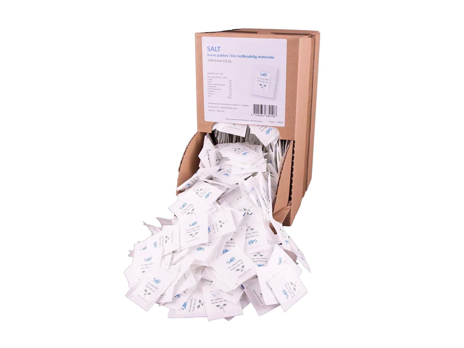 Salt i portionsbrev 0,7 gram Bionebrydelig emballage og i dispenser